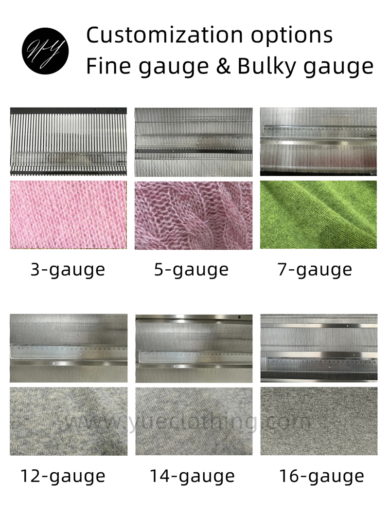 Our factory has a full set of sweater production equipment and provides one-stop service, we can produce both fine knit gauge and heavy gauge knitted sweaters. Including 3GG, 5GG, 7GG, 12GG, 14GG, 16GG, etc.